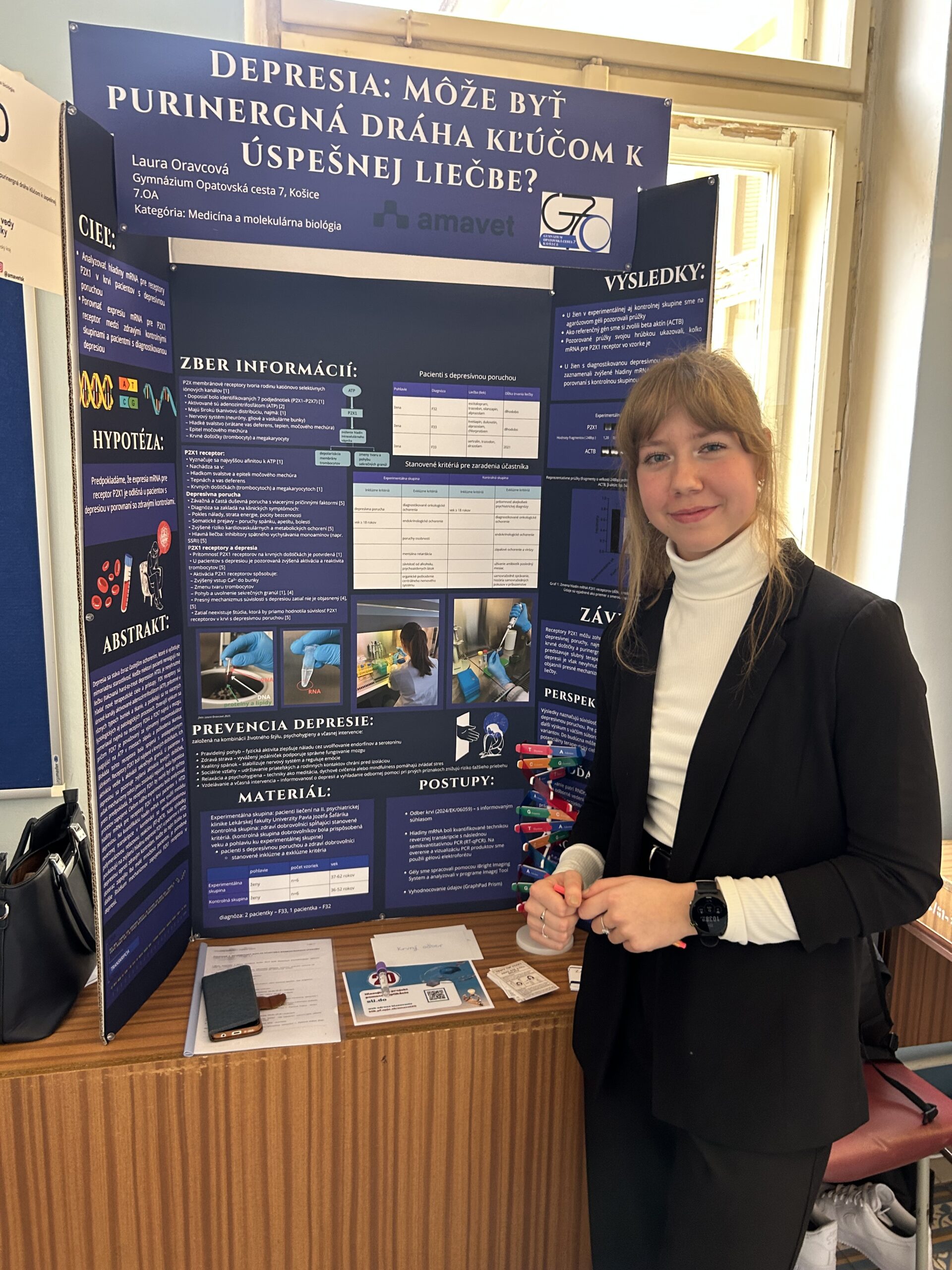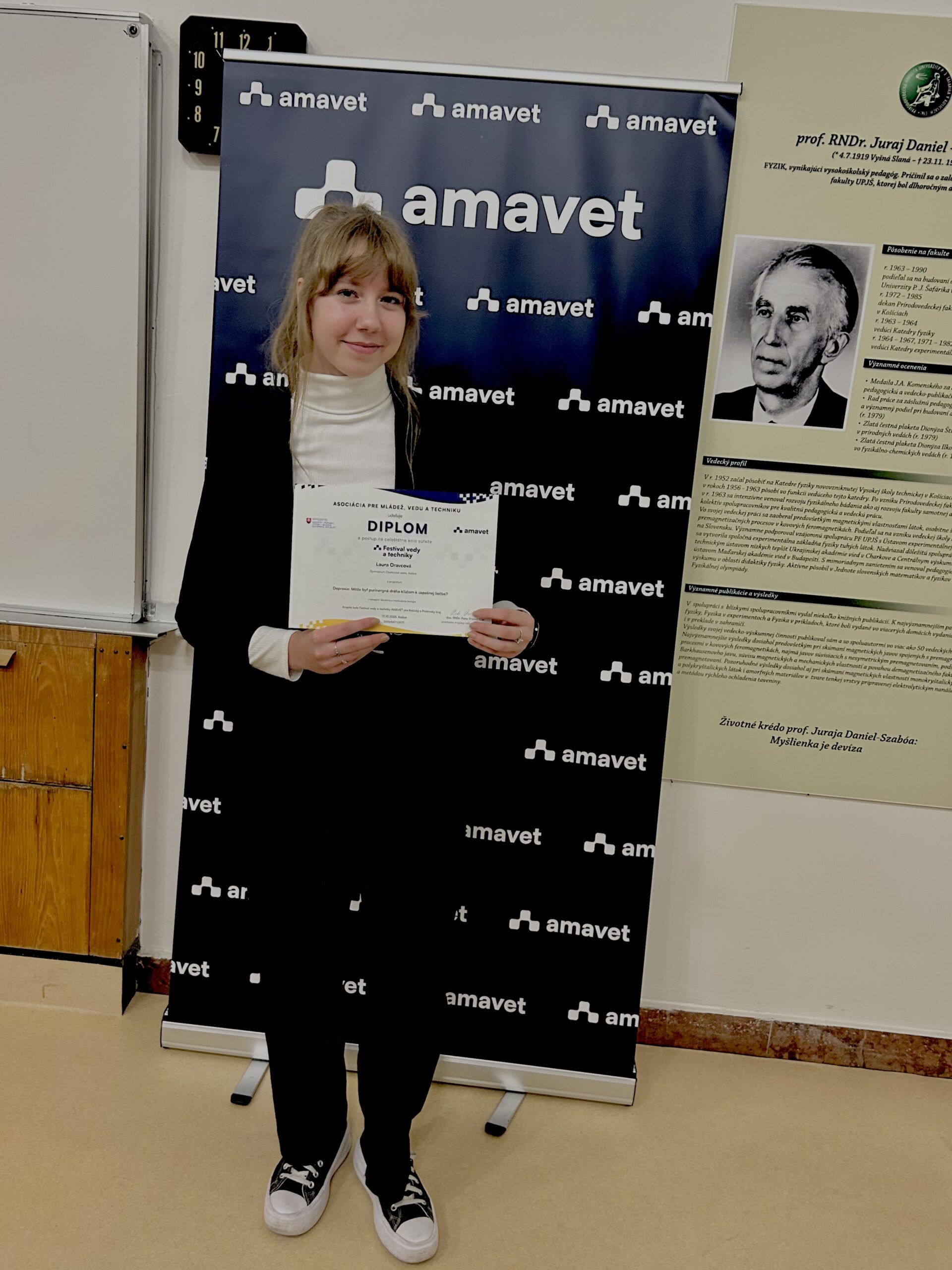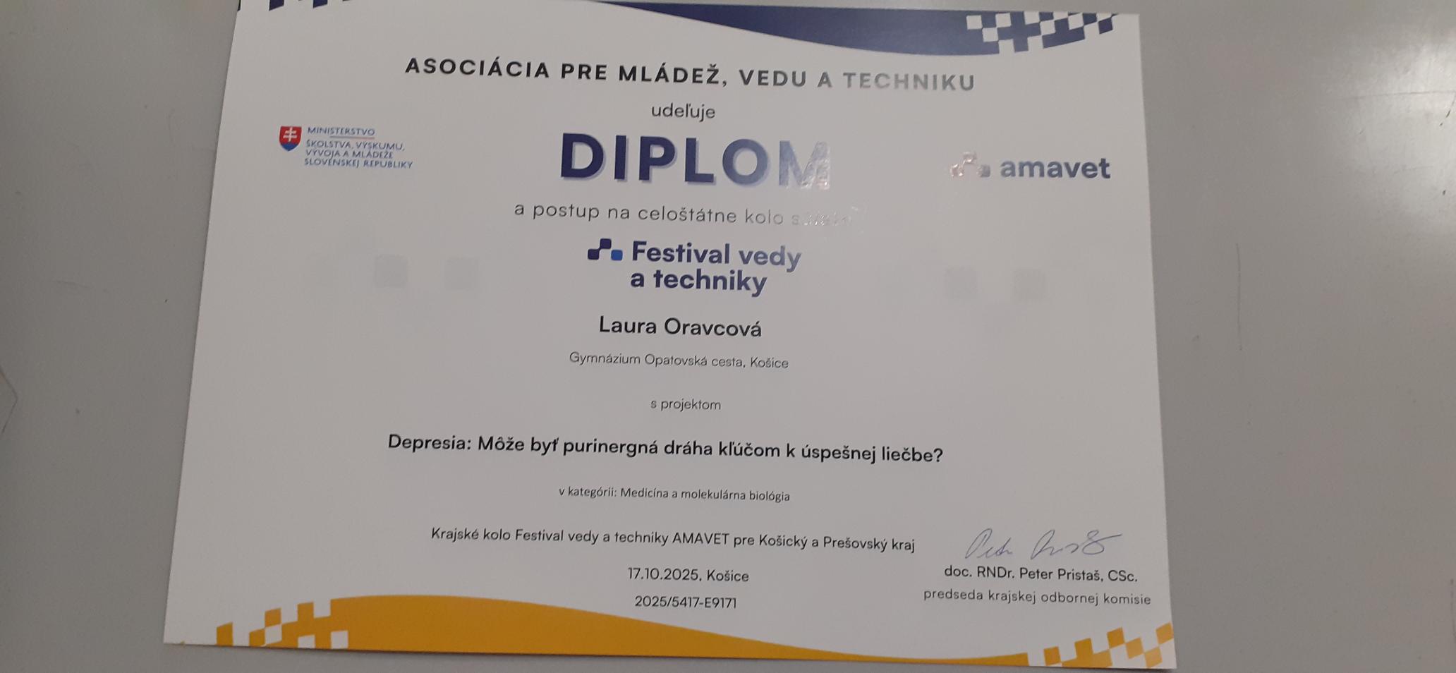 Dňa 17. októbra 2025 sa v priestoroch Prírodovedeckej fakulty UPJŠ v Košiciach uskutočnilo krajské kolo Festivalu vedy a techniky AMAVET. Projekty hodnotila komisia z radov vedcov a vysokoškolských pedagógov. Našu školu vynikajúco reprezentovala Laura Oravcová zo 7.OA. V kategórii Medicína a zdravotníctvo si vybojovala postup do celoslovenského kola AMAVET v Bratislave. Srdečne blahoželáme a držíme palce.